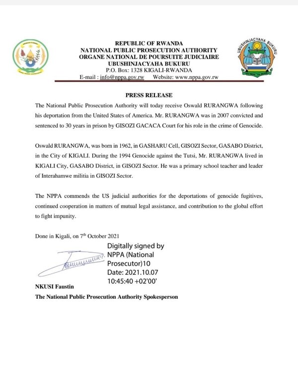 “Ubushinjacyaha bw’u Rwanda burashimira ubucamanza bwa Leta zunze Ubumwe za Amerika ku kwirukana ku butaka bwayo abakekwaho uruhare muri Jenoside bihisheyo, ubufatanye mu bijyanye n’amategeko n’umusanzu mu kurandura umuco wo kudahana.”