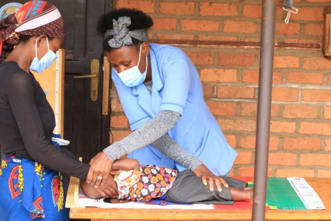 Mashesha Esther Zawadiyamungu umukozi ushizwe kurwanya imirire mibi mu bana ku kigonderabuzima cya Mashesha apima imikurire y’umwana