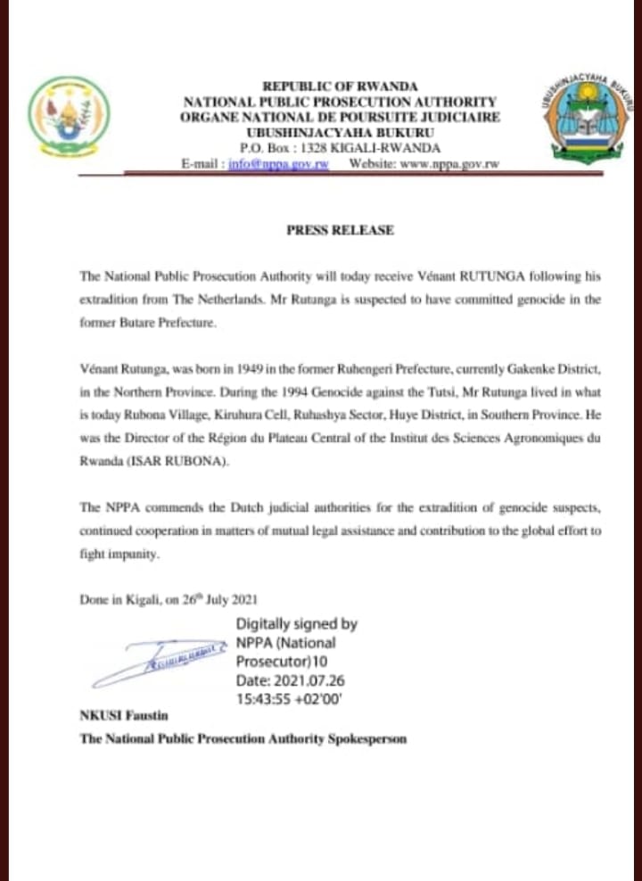 Umunyarwanda Rutunga Venant wabaga mu Buholandi akurikiranyweho uruhare yaba yaragize muri Jenoside yakorewe Abatutsi mu 1994 yegejejwe i Kigali mu Rwanda kuri uyu mugoroba.