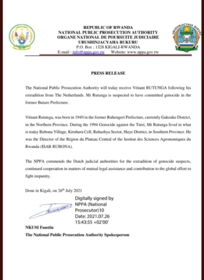 Umuvugizi w’Ubushinjacyaha Bukuru bw’u Rwanda, Nkusi yavuze ko yoherejwe n’Ubuholandi kugira ngo acirwe imanza ku ruhare muri Jenoside akekwaho n’u Rwanda yaba yarakoreye mu Ntara y’Amajyepfo hahoze ari muri Perefegitura ya Butare kuko yari umuyobozi wa ISAR Rubona, ikigo cyahoze ari icy’ubuhinzi.