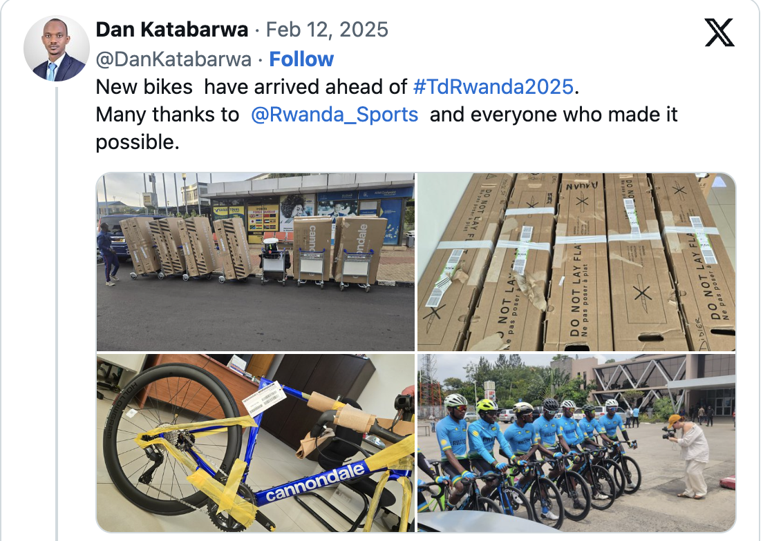 Mu magambo ye yagize ati “Amagare mashya yahageze mbere ya Tour du Rwanda 2025. Turashimira Minisiteri ya Siporo na buri wese watumye bishoboka.”