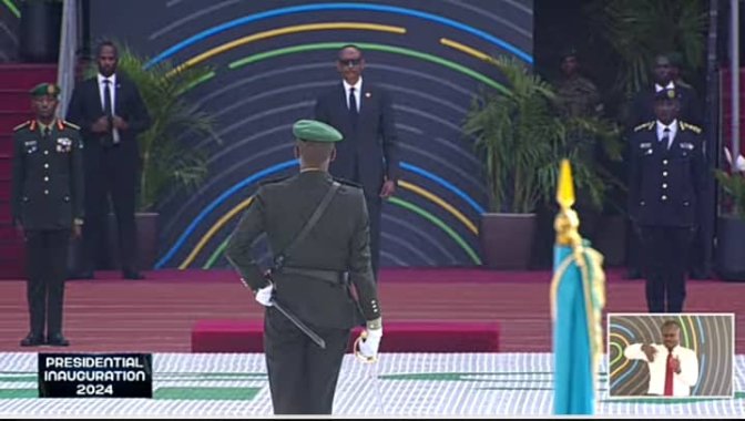 Nyuma yo gusinyira Indahiro, Perezida Kagame yahise ahabwa ibirango y’igihugu, Ibendera, ikiranganyego, inkota, Ingabo, abihabwa n’Umugaba Mukuru w’Ingabo Gen Muhanga Mubarak.