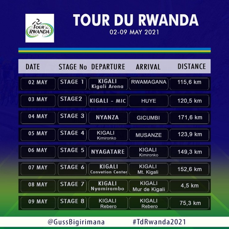 Rya siganwa ry’amagare riri ku rwego mpuzamahanga ryiswe Tour du Rwanda rizaba guhera tariki 2 kugeza tariki 09, Gicurasi, 2021.