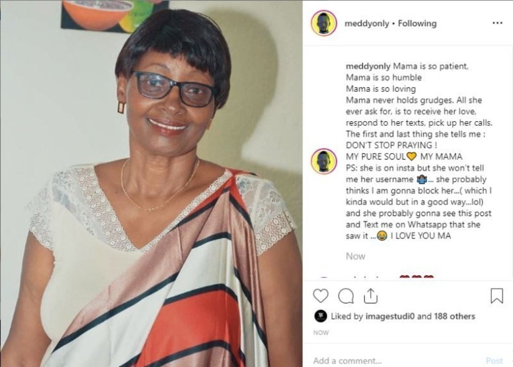Byanashimangiwe n’umunyamakuru Bayingana David uri mu nshuti za hafi za Meddy wanditse ku mbuga nkoranyambaga ze ati “Kubura umubyeyi [Mama] aba ari ibyago bikomeye. Komera cyane Meddy. Roho ye [Mama wa Meddy] iruhukire muri paradizo.”