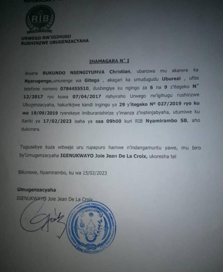 Mu makuru mamaurwagasabo ifitiye gihamya ni uko Chriss Eazy yahamagajwe n’urwego rw’Igihugu ry’ubugenzacyaha (RIB ) ku nshuro ya Kabiri ko agomba kwitaba tariki ya 21 Gashyantare 2023 saa 9h30’ za mugitondo i Nyamirambo mu biro by’ubugenzacyaha.
