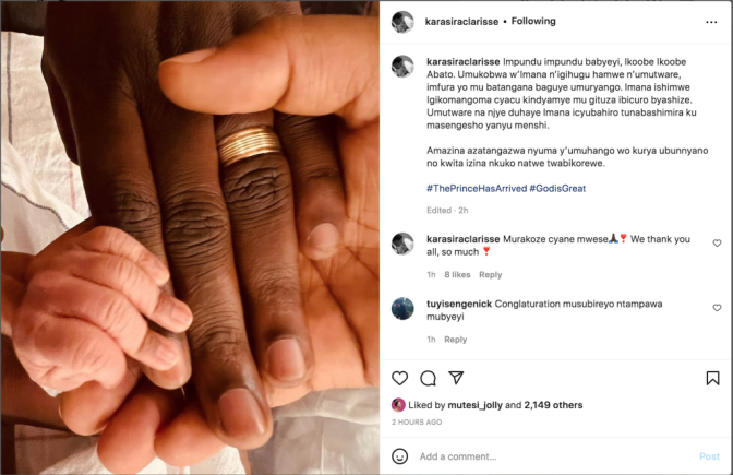 Clarisse Karasira yifashishije ifoto igaragaza ibiganza bye n’umugabo we ndetse n’icy’umwana wabo bibarutse, yagize ati “Impundu impundu babyeyi, Ikoobe Ikoobe Abato. Umukobwa w’Imana n’igihugu hamwe n’umutware, imfura yo mu batangana baguye umuryango.”