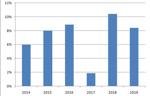 Ikigishushanyo cyerekana uko umusaruro mbumbe w’igihebwe cy’ambere kuva 2014 kugera 2019