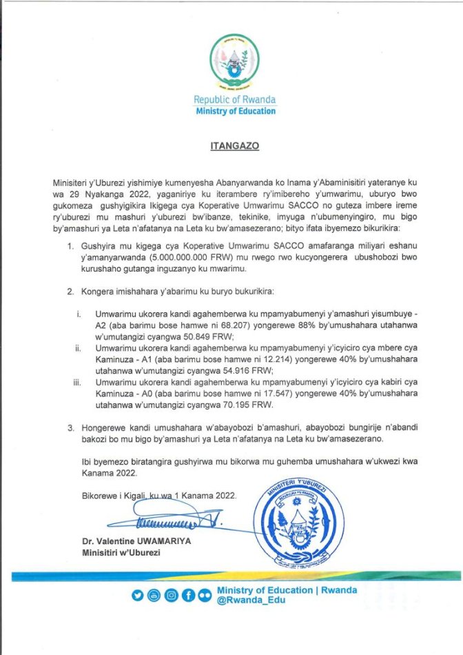 Ibi kandi birajyana n’uko Leta yamaze gushyira mu Umwarimu SACCO miliyari 5 zizabafasha kwiguriza amafaranga yo kwiteza imbere. Umushahara wazamuwe si uwa mwarimu gusa ahubwo n’abayobozi bagize nyobozi z’ibigo by’amashuri nawo wazamuwe, (Headmaster nabo bayoborana).